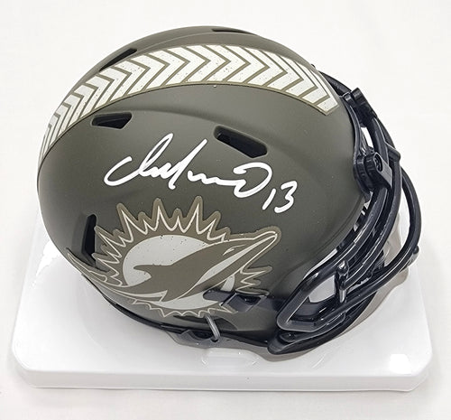 This Salute To Service Mini Helmet was personally hand signed by Dan Marino in white paint marker. The Mini Helmet was signed in the presence of a Beckett Authentication Services...