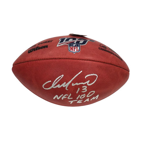 This Wilson The Duke NFL 100 Football was personally hand signed by Dan Marino in silver paint marker with the inscription "NFL 100 Team". The Football was signed in the presence of a Beckett Authentication Services Representative and comes affixed with a witnessed individual numbered tamper-evident sticker and matching Certificate of Authenticity card. The Football also comes with a Famousink hologram guaranteeing authenticity for life. Domestic ground shipping for this item is FREE to the contiguous 48 states. Please contact us for International and other shipping options.