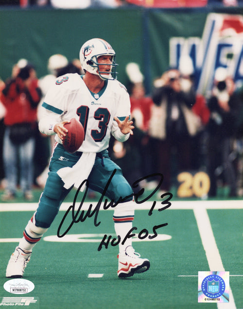 Own a piece of NFL history with this authentic Dan Marino autographed Miami Dolphins 8×10 photo, signed with the inscription “HOF ’05” and JSA witnessed for unequivocal verification. This high-quality photograph captures Marino — a Hall of Fame legend — in his iconic Dolphins uniform, commemorating his 2005 induction into the Pro Football Hall of Fame.