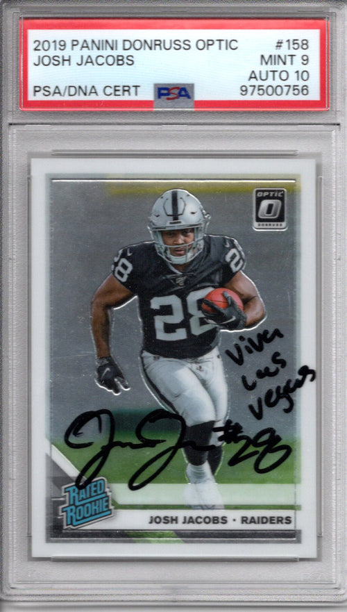 This 2019 Panini Donruss Optic Trading Card was personally hand signed by Eric Dickerson in black marker with "Viva Las Vegas". The Card is GRADED Mint 9 AUTO 10 and encapsulated by PSA. Domestic ground shipping for this item is FREE to the contiguous 48 states. Please contact us for International and other shipping options.