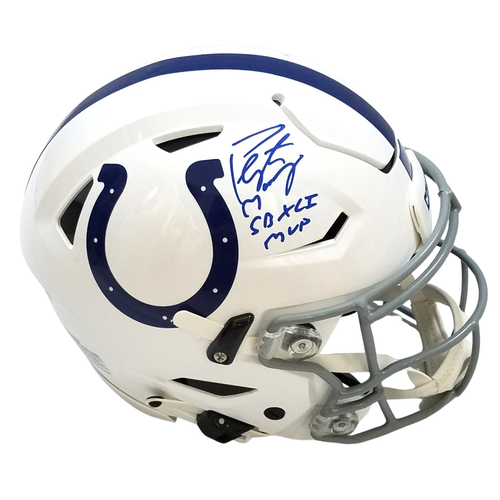 This Speed Flex Helmet was personally hand signed by Peyton Manning in blue paint marker with the inscription "SB XLI MVP". The Helmet was signed in the presence of a Fanatics Authentic Representative and comes affixed with an individual numbered tamper-evident hologram. The Helmet also comes with a Famousink hologram guaranteeing authenticity for life. Domestic ground shipping for this item is FREE to the contiguous 48 states. Please contact us for International and other shipping options.