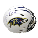 This Riddell Speed Matte White Authentic Helmet was personally hand signed by Ray Lewis in purple paint marker with the inscription "HOF 18". The Helmet was signed in the presence of a Beckett Authentication Services Representative and comes affixed with a witnessed individual numbered tamper-evident sticker and matching Certificate of Authenticity card. The Helmet also comes with a Famousink hologram guaranteeing authenticity for life. Domestic ground shipping for this item is FREE to the contiguous 48 states. Please contact us for International and other shipping options.