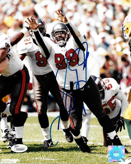 This Licensed Photo was personally hand signed by Warren Sapp in blue marker. The photo is Authenticated by JSA and comes affixed with a individual numbered tamper-evident sticker and matching Certificate of Authenticity card. The photo also comes with a Famousink hologram guaranteeing authenticity for life. Domestic ground shipping for this item is FREE to the contiguous 48 states. Please contact us for International and other shipping options.