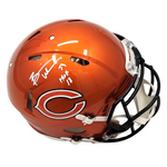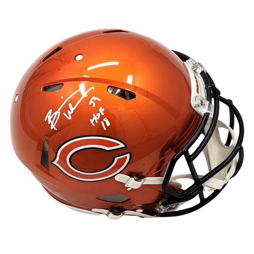 This Riddell Authentic Flash Helmet was personally hand signed by Brian Urlacher in white paint marker with the inscription "HOF 18". The Helmet was signed in the presence of a Beckett Authentication Services Representative and comes affixed with a witnessed individual numbered tamper-evident Hologram. The Helmet also comes with a Famous Ink hologram guaranteeing authenticity for life. Domestic ground shipping for this item is FREE to the contiguous 48 states. Please contact us for International and other shipping options.