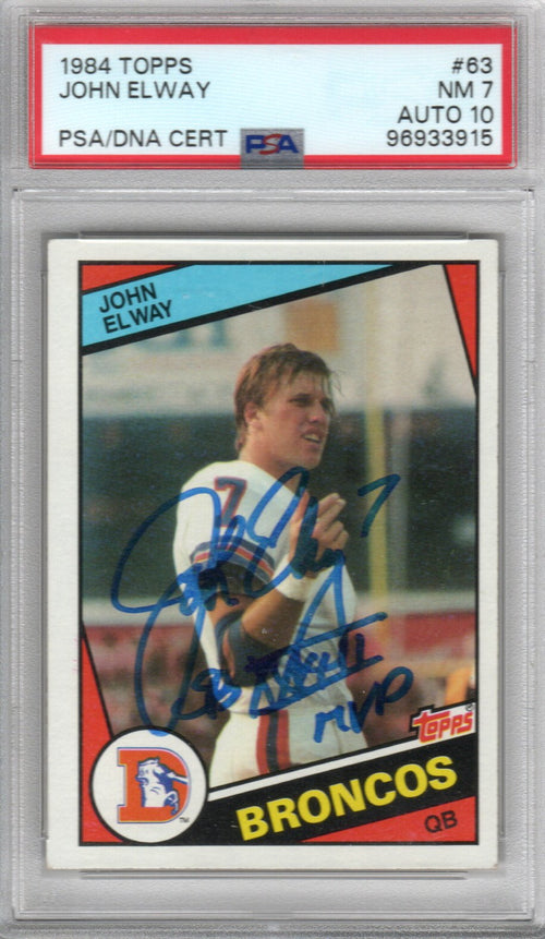 This 1984 Topps Rookie Trading Card #63 (96933915) was personally hand signed by John Elway in blue marker with "SB XXXII MVP". The Card is Graded NM 7AUTO 10 and encapsulated by PSA. Domestic ground shipping for this item is FREE to the contiguous 48 states. Please contact us for International and other shipping options.