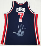 This Mitchell & Ness Authentic Jersey was personally hand signed by Larry Bird in silver marker with Larry's Hand Print in white acrylic paint. The Jersey was signed in the presence of a Beckett Authentication Services Representative and comes affixed with a witnessed individual numbered hologram. The Jersey also comes with a Famous ink and Larry Bird holograms guaranteeing authenticity for life. Domestic ground shipping for this item is FREE to the contiguous 48 states. Please contact us for International and other shipping options.